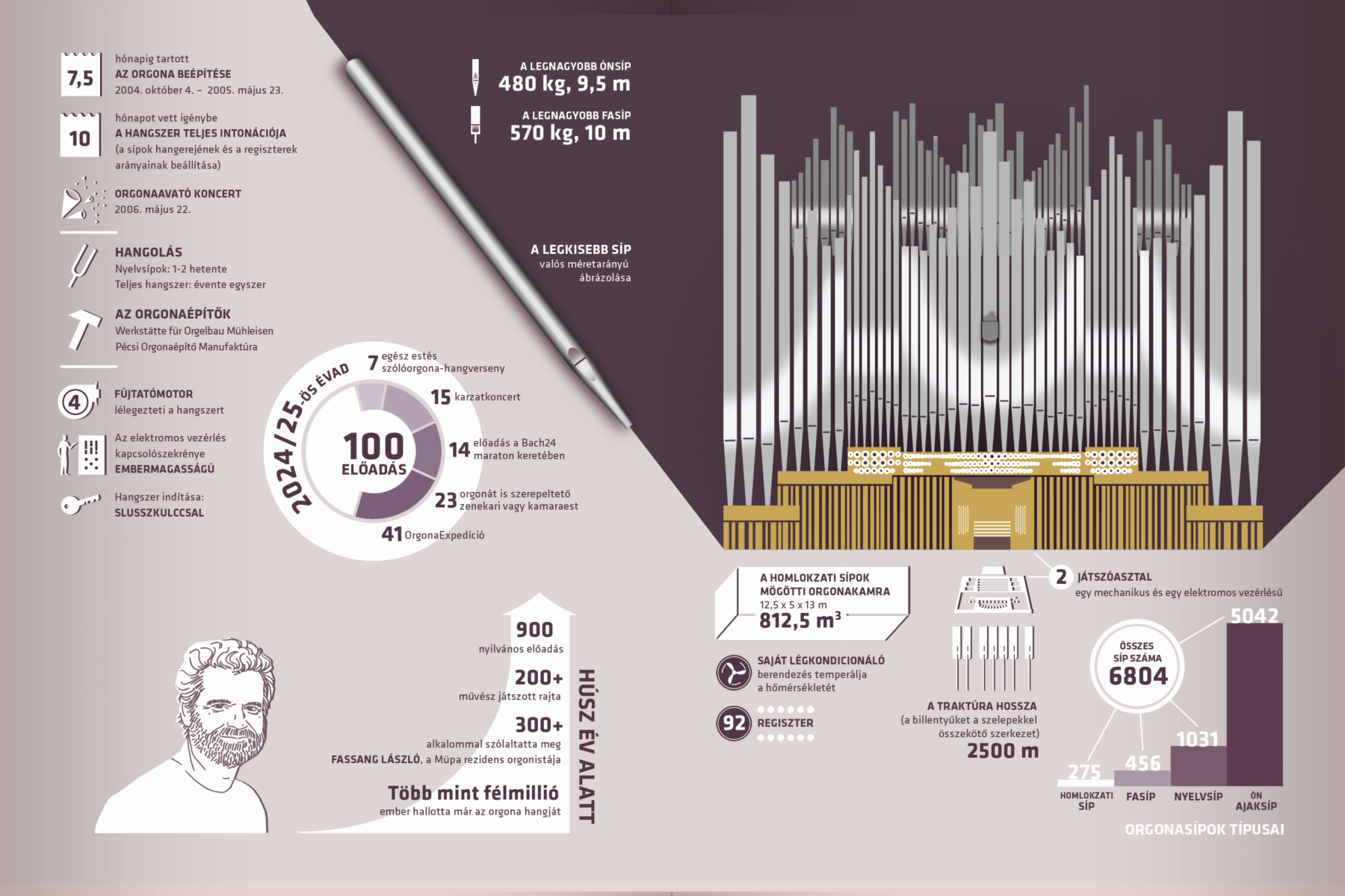 Épület az épületben, ami megszólal. A Müpa hangversenytermébe szervesen beépülő, attól elválaszthatatlan instrumentum. Az ötszintes lakóház méretű orgonakamra beépítésével az orgona készítői 6804 síp megszólalását tették lehetővé, a hangszeren játszó orgonisták pedig az élettelen alkotóelemekből szárnyaló zenei valóságot teremtenek. Az előállítható hangzások végtelen száma folyamatos felfedezésre inspirál, a játékasztalnál pedig egy valóságos zenei játszótér teremti meg a végtelenített játék lehetőségét. A teremtő képzelet segítségével az anyag olyan szubsztanciává lényegül át, melyhez minden hallgató a saját belső világa szerint kapcsolódhat.