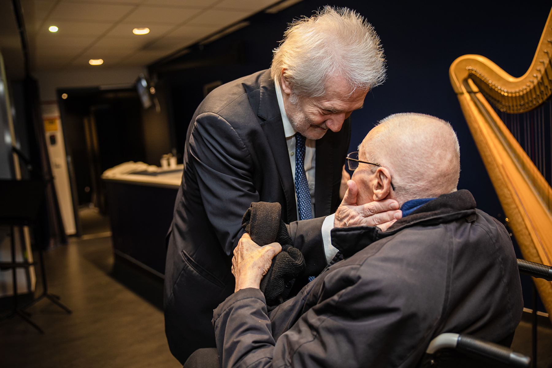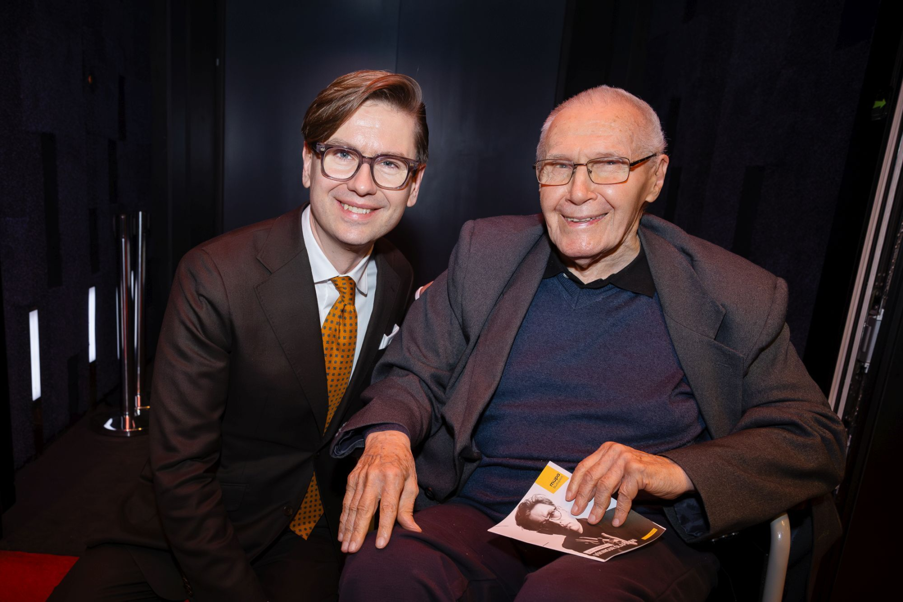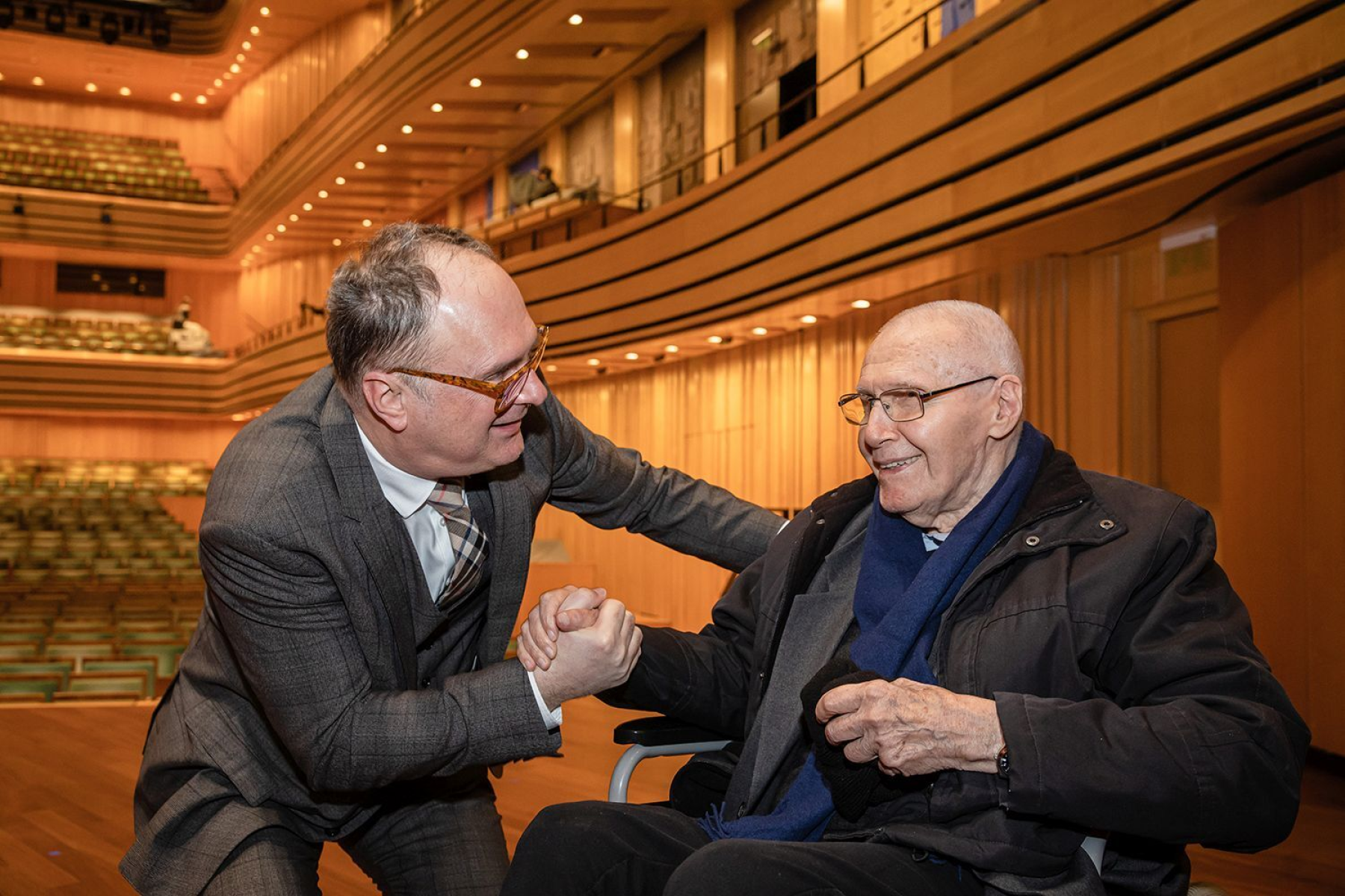 Kurtág György gratulál barátjának és pályatársának, Eötvös Péternek a Klangforum Wiennel közös 2023-as koncertje után